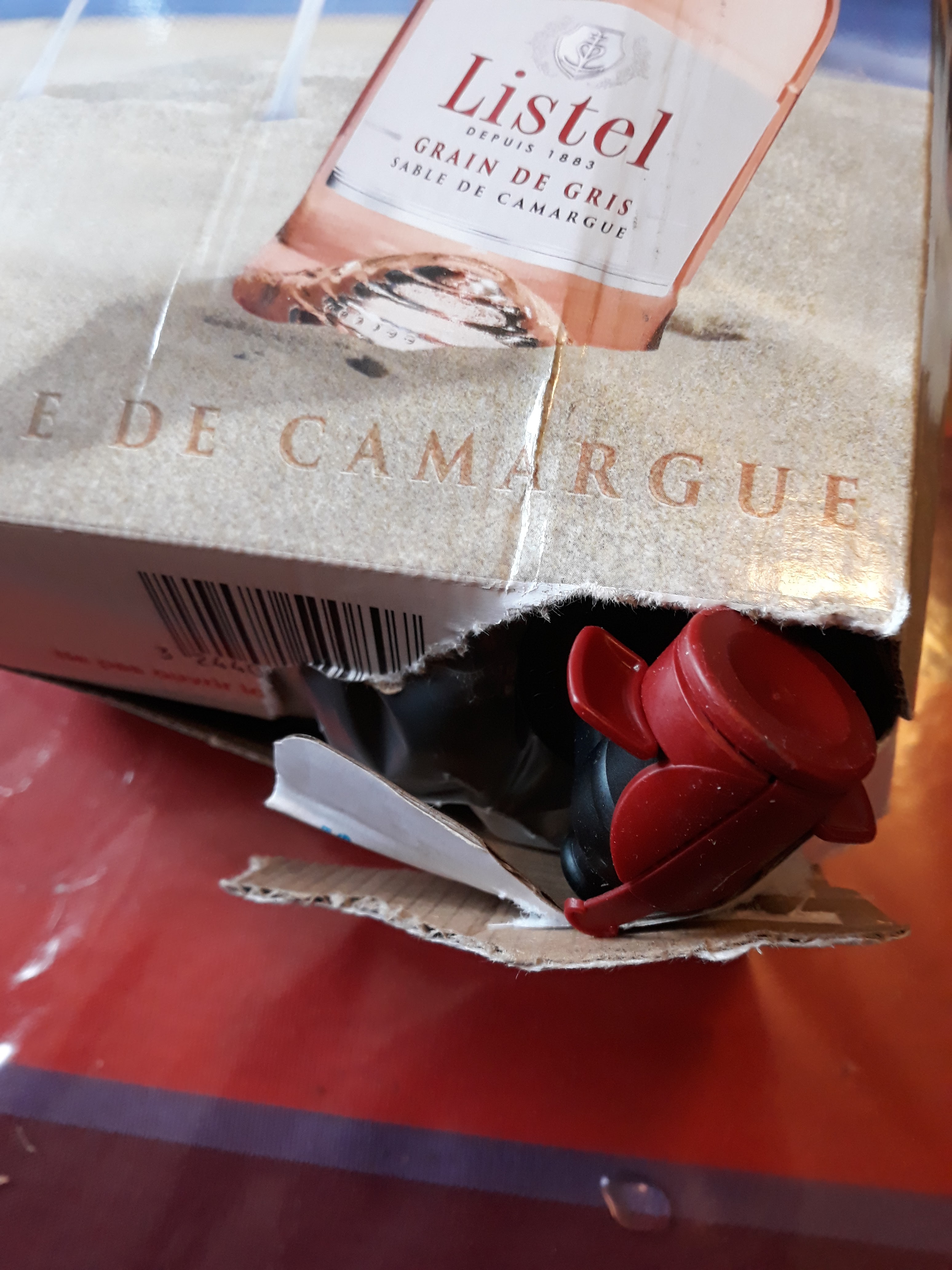 Achat au drive d'un bag in box, me suis aperçue que le carton est éventé depuis fort longtemps vu son état : bec verseur à nu ( pas le top niveau sanitaire) cependant pas d'écoulement de liquide. Je constate que la qualité et la confiance sont de moins en moins présentes!
