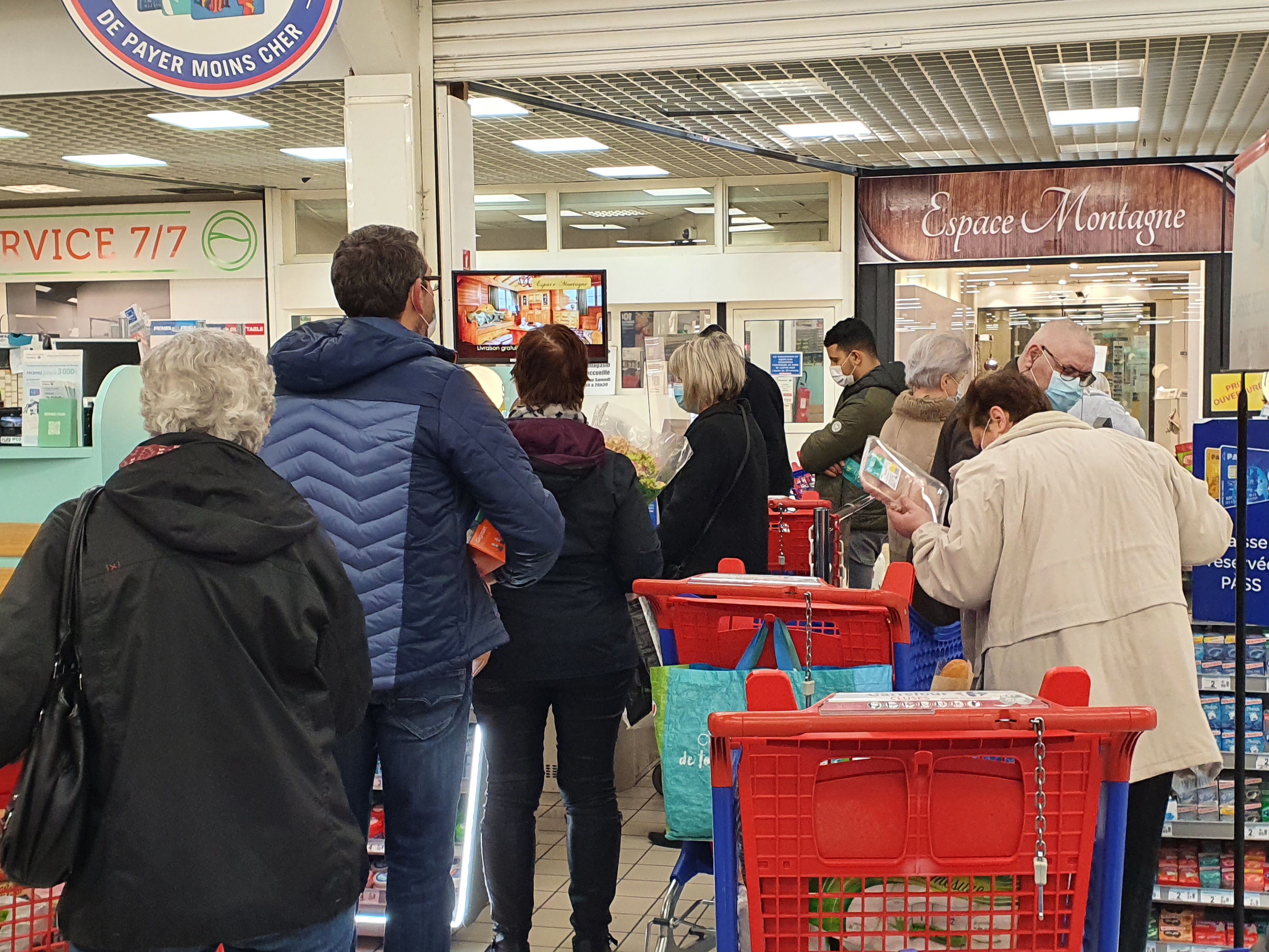 Alors que de nombreuses caisses sont fermees, les clients sont entassés aux deux caisses PASS ouvertes cote à côté. Moins de 50cm entre les clients. Inadmissible, les gestes barrière ne sont pas respectés.