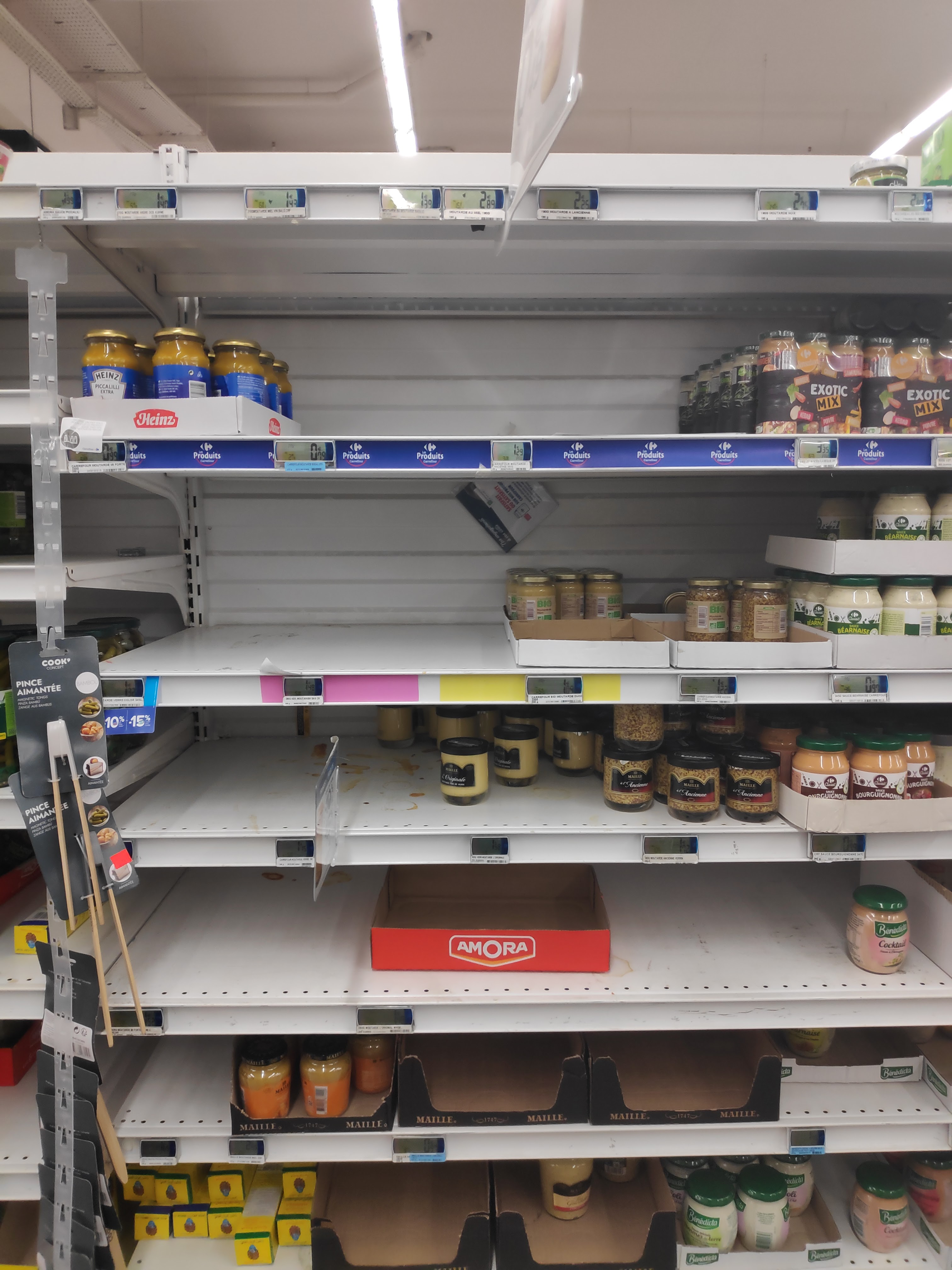 Tous les produits classiques sont là, rayon fruits et légumes, rayon poissons, rayons viandes, rayon traiteur, rayon surgelés, produits locaux ... Il y a même du petit électroménager et des accessoires de la vie courante types câble HDMI, prises électriques, outils de bricolage etc Pas besoin de prendre la voiture pour aller dans un hypermarché ! Dommage que certains pensent qu'ils vont mourir s'ils n'ont plus de moutarde... d'où la photo du rayon vide. Le personnel est souriant et serviable, tant aux caisses que dans les rayons. Le temps d'attente aux caisses est raisonnable, surtout qu'il y a une zone de caisse automatique pour gagner du temps quand on a que quelques articles. C'est sûr, je vais regretter mon Carrefour Confluence quand je quitterai le quartier :'(