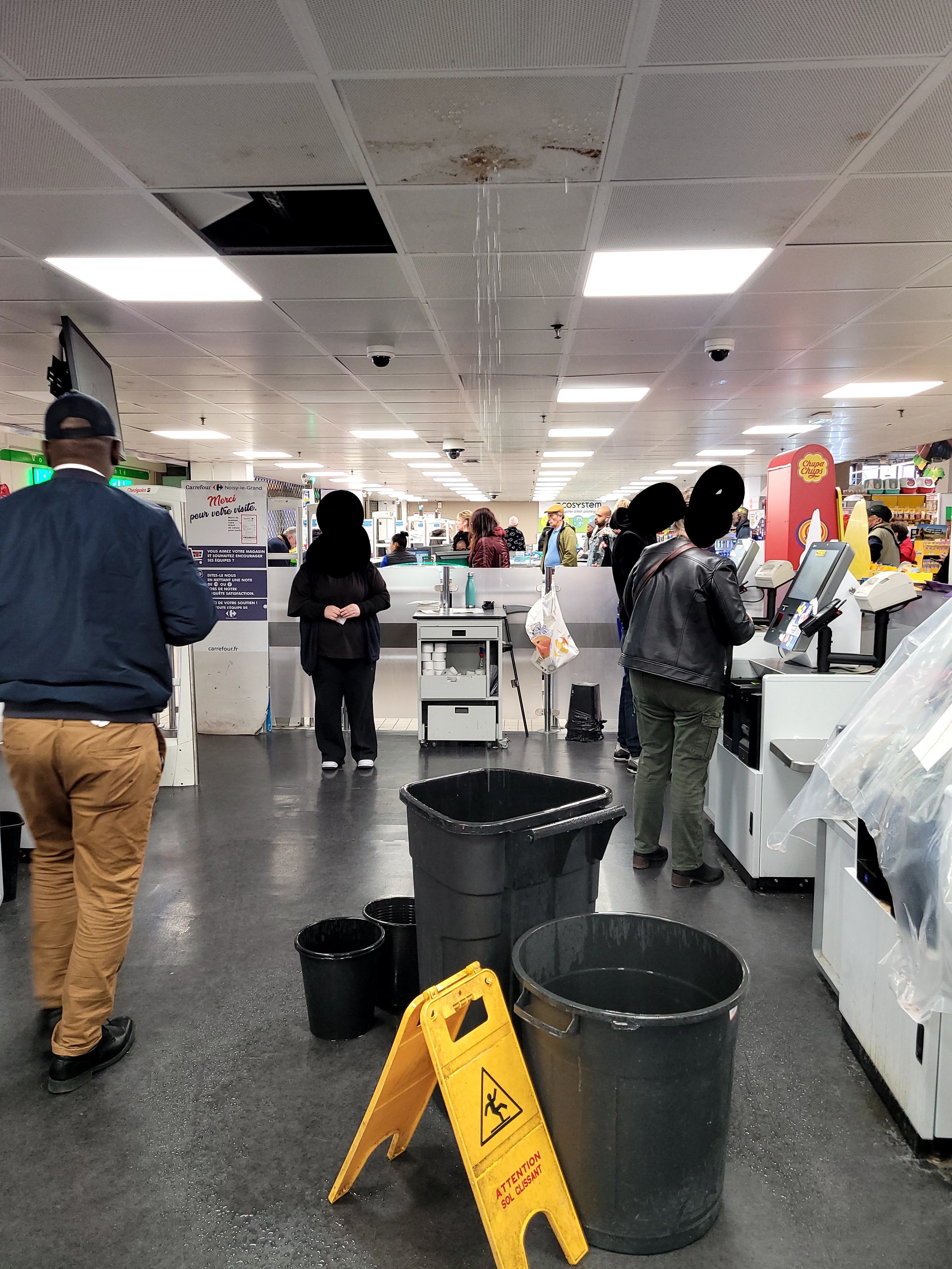 23 octobre 2023 Une énorme fuite d'eau au milieu des caisses libre service au RDC en provenant du plafond du magasin de Carrefour noisy le grand. Inadmissible, il y a des fuites récurantes depuis des mois de part et d'autre du magasin, mais là l'eau coule à flots et les clients évoluent au milieu de cette misère. Il y a aussi des fuites venant du plafond devant les caisses LS. La direction attend que les plafonds s'éfondre sur les clients !