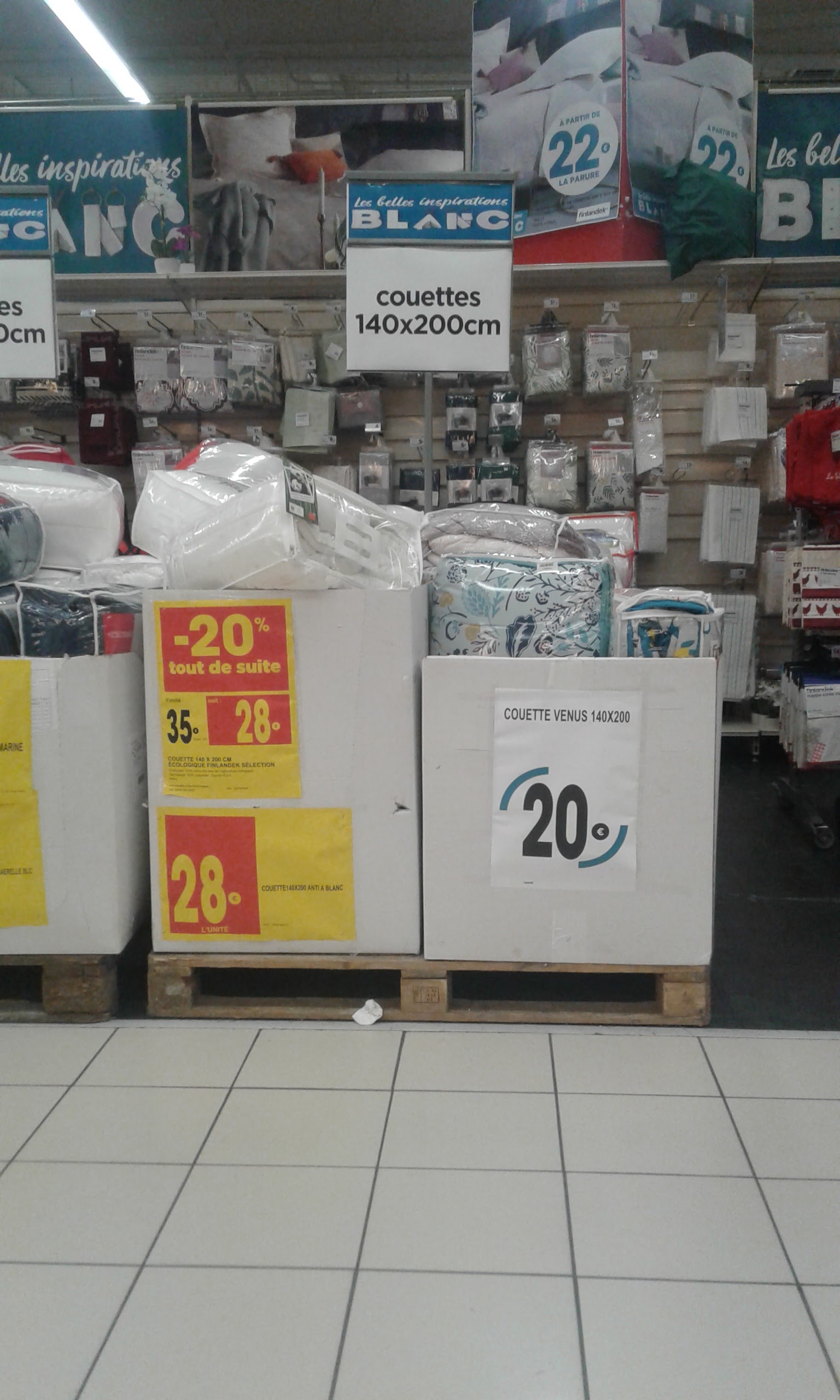 Énième visite dans ce magasin et toujours les mêmes problèmes d étiquetages. Exemple la même huile de Colza (même code BARRE) Disponible dans 3 rayons avec 2 étiquetages à des prix différents et un rayon sans étiquette... A la borne de contrôle encore un prix différent ? La caissière nous a fait le prix le plus bas. Merci à elle. Je ne parle pas des promotions qui ne sont pas mises à jours dans les rayons J en déduit qu il y a un manque de professionnalisme de la part de la direction responsable de la mise en rayon. Car si vous N êtes pas attentif vous vous faites avoir. Cela est inadmissible de la part d un réseau aussi connu. Également la sonorisation est déplorable avec des bruits d oiseaux insupportable surtout dans un magasin vide