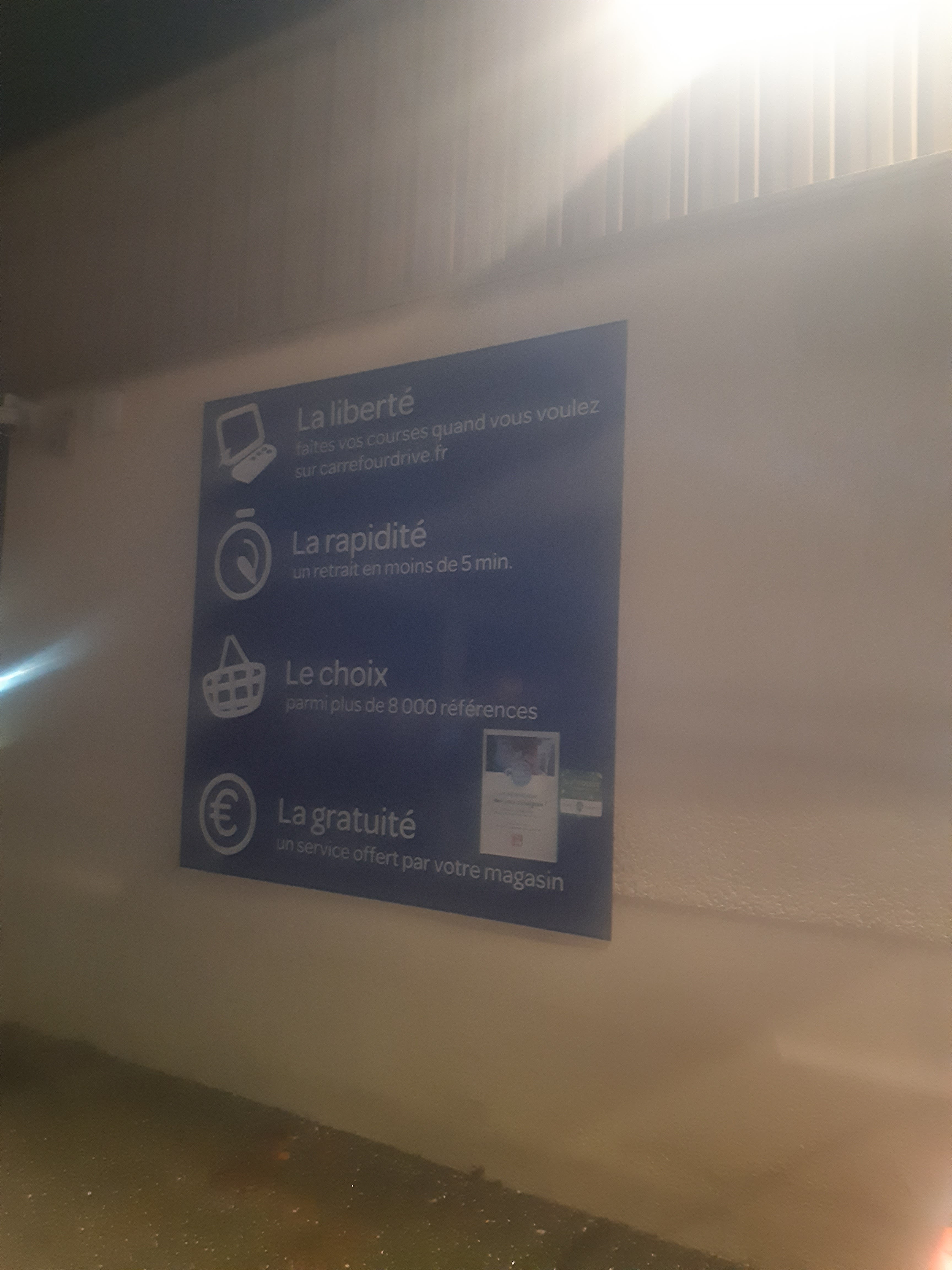 Un service long, des infrastructures pas adaptées, de l'attente au service (entre 10 et 45 minutes selon le jour), des produits remplacés à chaque commande, des propositions de remplacement de produits ridicules (vin qui n'a rien à voir, huile moteur essence pour vidange remplacé par une huile diesel)... et j'en passe. Chaque commande a été une déception mais surtout, une perte de temps. (Cet avis est rédigé depuis ma voiture, dans laquelle j'attends depuis 30 minutes et dans laquelle je vais également attendre les 30 prochaines minutes). C'était la dernière fois pour moi. Il est temps que Carrefour France révise sa définition d'un service client. Ps : on n'est plus sur 5 minutes de retrait là mais plutôt 1h15, faudrait revoir vos arguments non ?