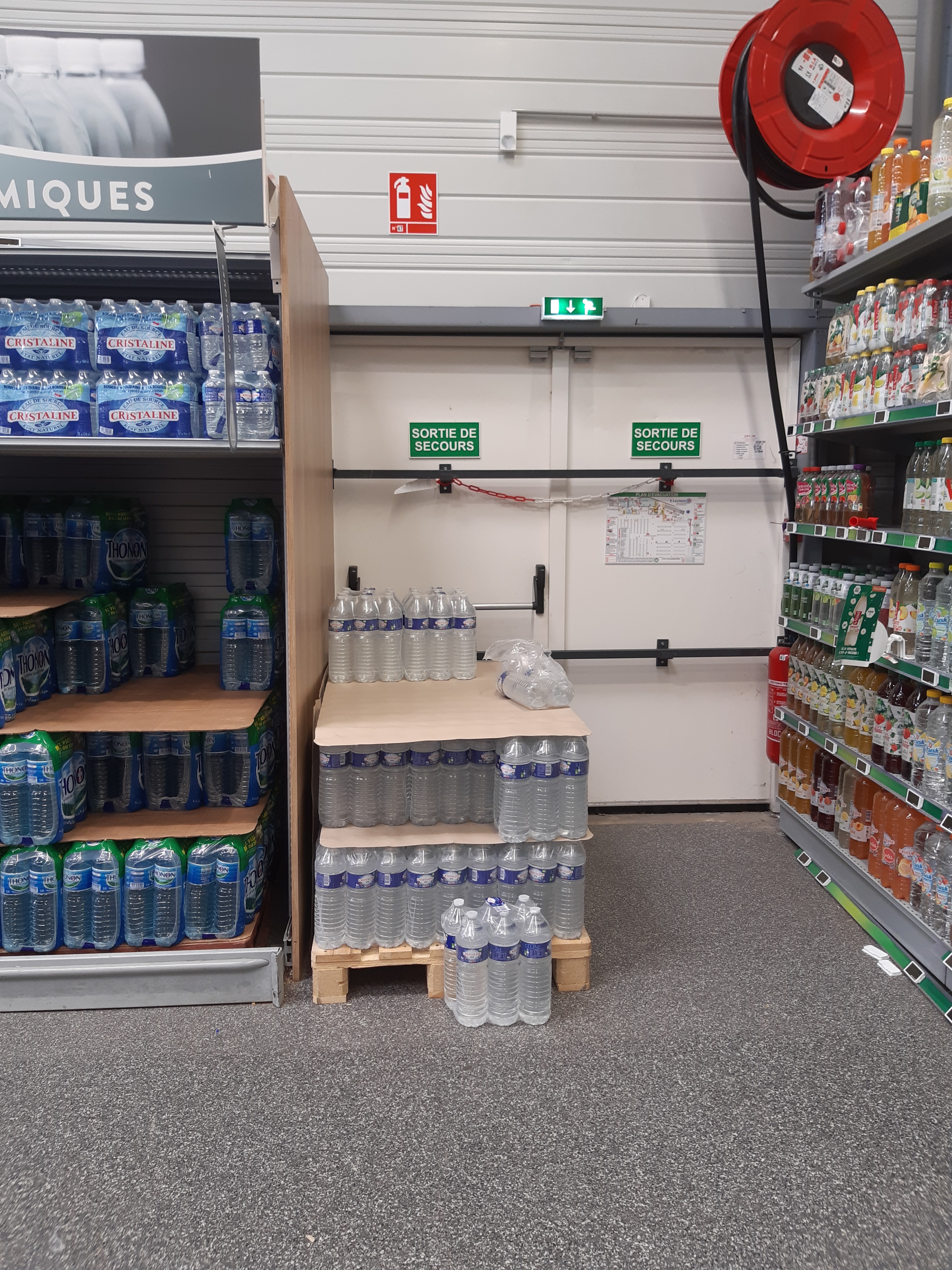 Chassez le naturel, il revient au galop, il n'aura pas fallu bien longtemps pour que la palette de Cristalline ne reprenne sa place devant la sortie de secours. Pire encore, ce dimanche 17 juillet, il y avait aussi les barres métalliques qui verrouillaient la porte. D'ailleurs, ces barres doivent être remisées hors zone de circulation et ne pas trainer au sol devant la porte, risquant d'entraver une éventuelle évacuation (ce qui n'a jamais été le cas). Je me demande ce qu'en penserait la commission de sécurité? photos prises les 15/07 et 17/07